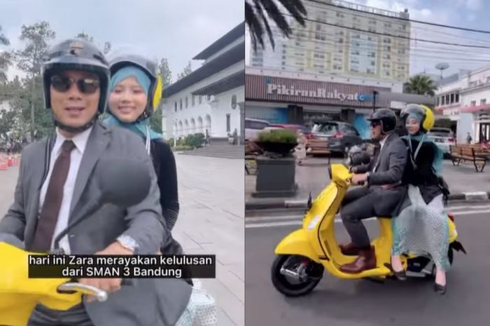 Uniknya, gubernur Jawa Barat ini merayakan kelulusan putri kesayangannya dengan membonceng Zara menaiki Vespa matic.