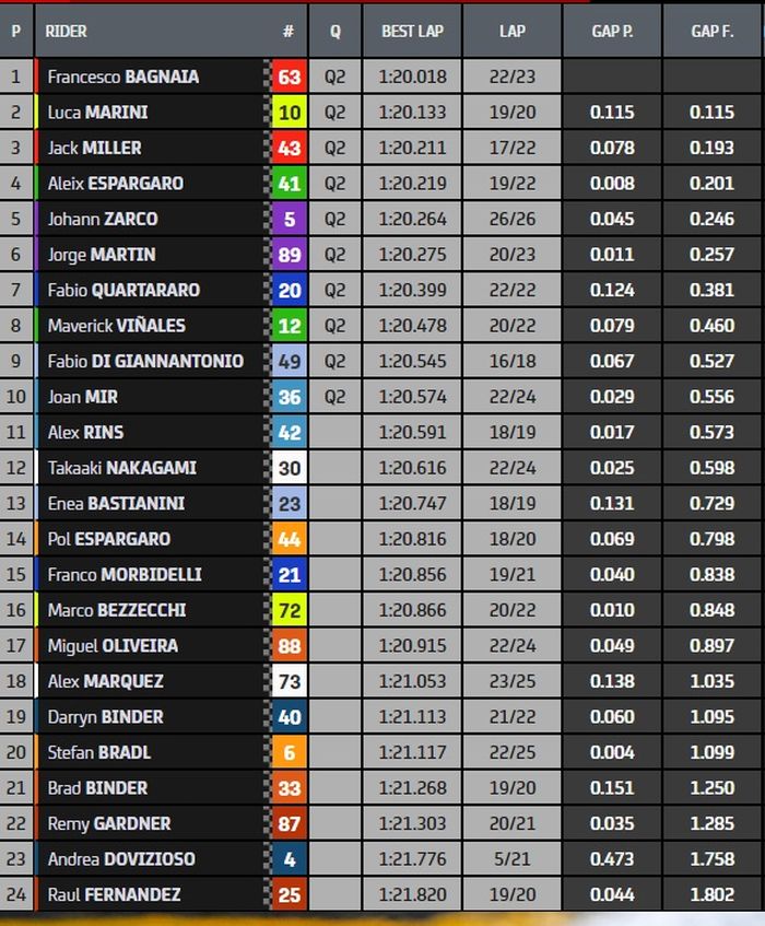 Di posisi kedua, ada adik dari Valentino Rossi, Luca Marini yang mencatatkan waktu 1 menit 20,133 detik.