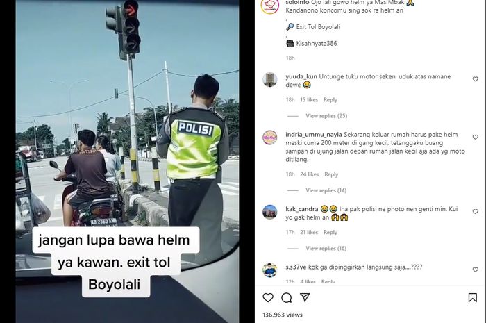 Sebuah video yang diunggah akun Instagram @soloinfo menampilkan beberapa pemotor yang tidak memakai helm berhenti di sebuah lampu merah.