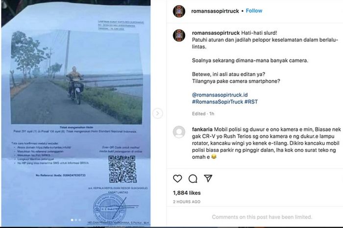 Adapun foto yang diunggah merupakan lembaran surat tilang elektronik yang di dalamnya terdapat foto pengendara motor tertangkap kamera ETLE disertai keterangan tidak menggunakan helm.