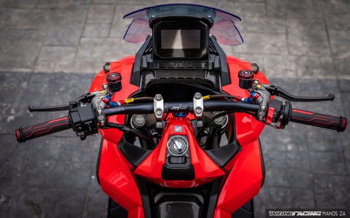 Mulai dari area kokpit, setang orisinil telah diganti setang fatbar yang lebih lebar.