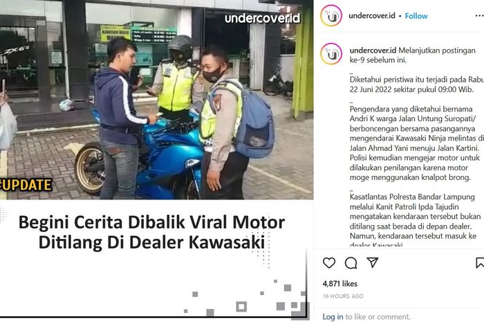 "Dia masuk ke dealer Kawasaki langsung disetop oleh anggota saya karena knalpot blong, langsung disetop, dijelaskan dan ditilang," kata Tajudin saat dikonfirmasi, Kamis (23/6).