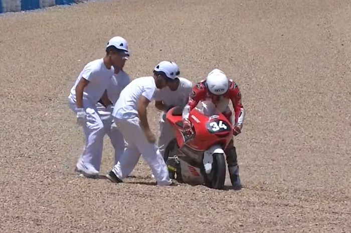 MOTOR Plus-online.com - Pembalap Indonesia, Fadillah Arbi Aditama mengalami crash di race kedua FIM JuniorGP Moto3 2022 di sirkuit Jerez, (3/7/2022).