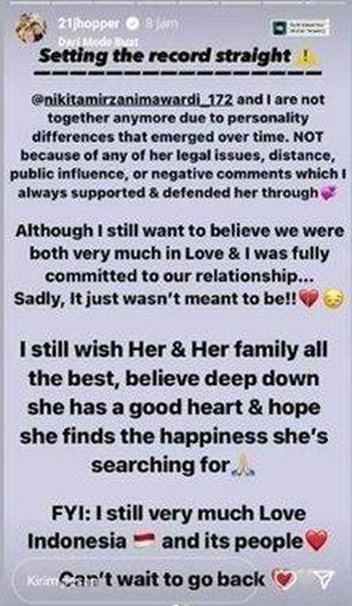 "Saya dan @nikitamirzanimawardi_172 sudah tidak bersama lagi karena perbedaan kepribadian yang muncul dari waktu ke waktu," tulis Hopkins.