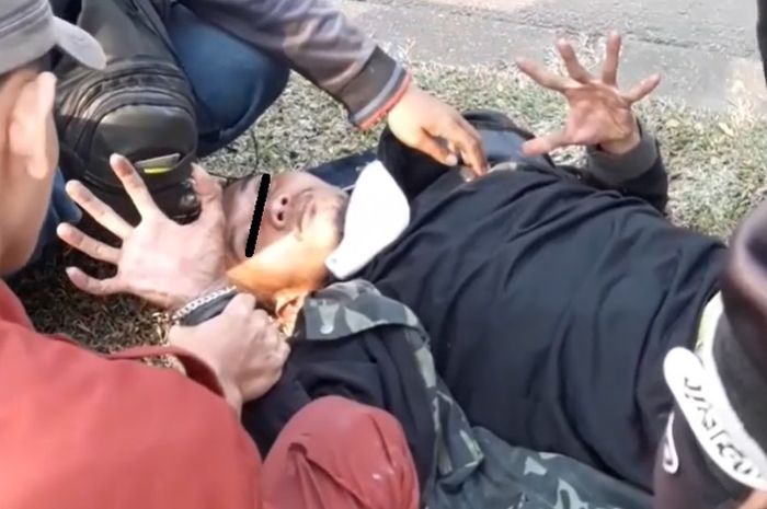 Dalam video tersebut, terlihat seorang pria yang mengenakan kaos dan jaket hitam tergeletak di tanah pinggir jalan dan dikelilingi warga.