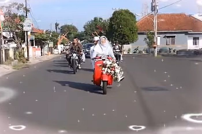 MOTOR Plus-online.com - Video emak-emak berkebaya naik Vespa sambil membonceng anaknya yang calon pengantin ke tempat pernikahannya.