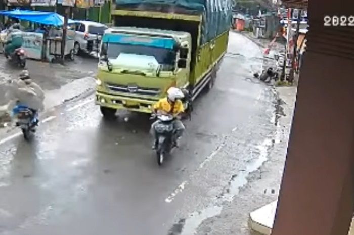Terlihat dalam video, truk Hino warna hijau menabrak motor pertama sampai si pemotor terjatuh ke jalan.