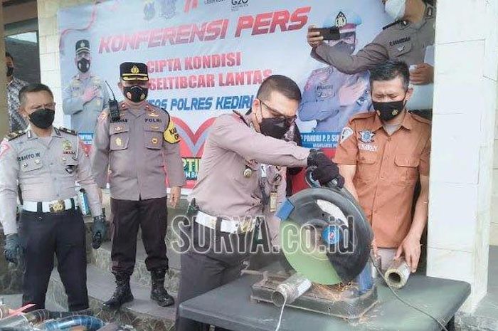 Pada saat menggelar razia, anggota kepolisian kota Kediri memergoki salah satu pemotor knalpot brong modifikasi.