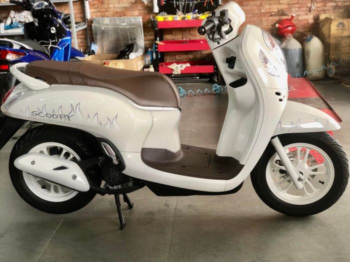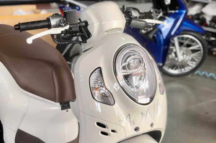 Warna putih dengan grafis api milik Vespa x Justin Bieber tampak dicontek oleh Honda Scoopy ini.