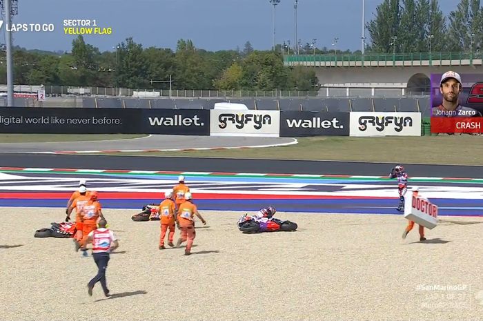 Sayangnya baru mulai terjadi insiden antara dua pembalap Ducati Johann Zarco dan Michele Pirro yang menyeret Pol Espargaro (Repsol Honda).