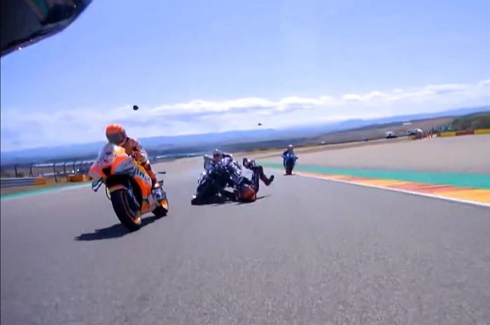 Akibatnya bintang Monster Energy Yamaha itu terpental keras yang membuatnya menyudahi balapan paling awal di MotoGP Aragon 2022.