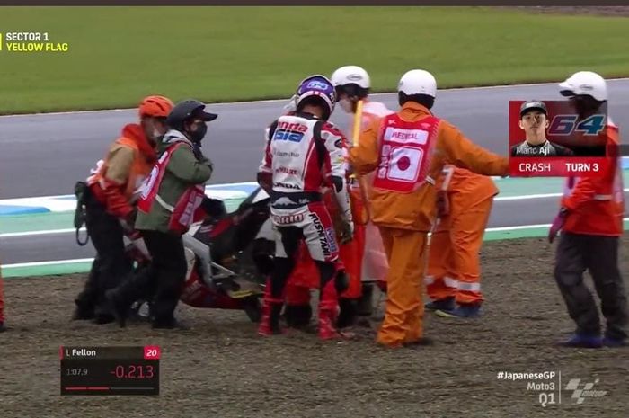 MOTOR Plus-Online.com - Hasil Kualifikasi Moto3 Jepang 2022, pembalap Indonesia Mario Aji crash, segini posisi start balapnya besok.
