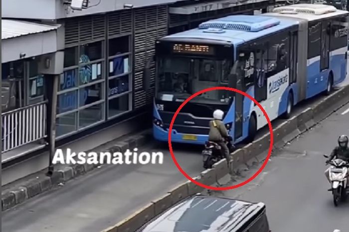 Pemotor itu kemudian terlihat memaksa ingin mengambil celah beton saparator Busway untuk keluar dari jalur khusus bus tersebut.
