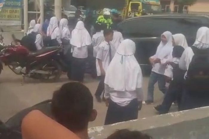Dalam video tersebut, tampak anggota polisi yang sedang melintasi anak-anak sekolah, kemudian direkam oleh seorang siswa.