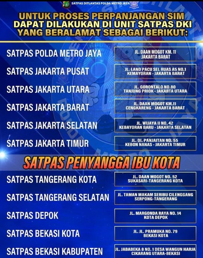 Kemudian, Satpas Penyangga Ibu Kota hadir di 5 titik, mulai dari Tangerang Kota hingga Bekasi Kabupaten, yang bisa dilihat daftarnya pada gambar di bawah: