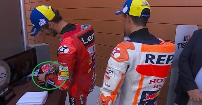 Kejadian tersebut bermula saat kamera mengarah ke Francesco Bagnaia berada di belakang podium.
