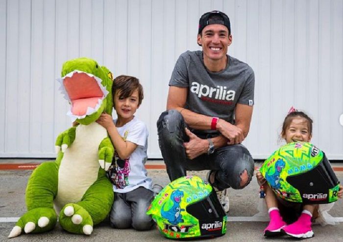 Dikutip MOTOR Plus-online dari akun Instagram @aleixespargaro, Pembalap Tim Aprilia ini bersama kedua anaknya memamerkan helm berwarna hijau bergambar Dinosaurus.