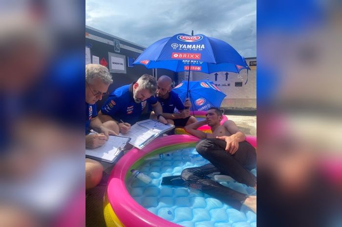 MOTOR Plus-Online.com - Toprak Razgatlioglu berendam di kolam karet sambil rapat teknis dengan tim di sela-sela WSBK Mandalika 2022, ada-ada saja nih!