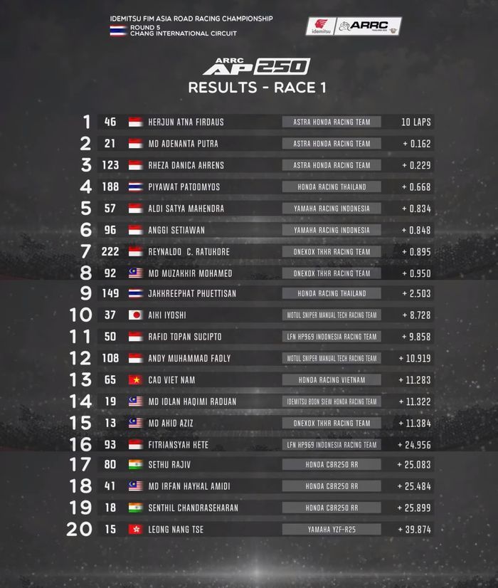 Simak hasil race 1 AP250 ARRC Thailand 2022 di bawah ini: