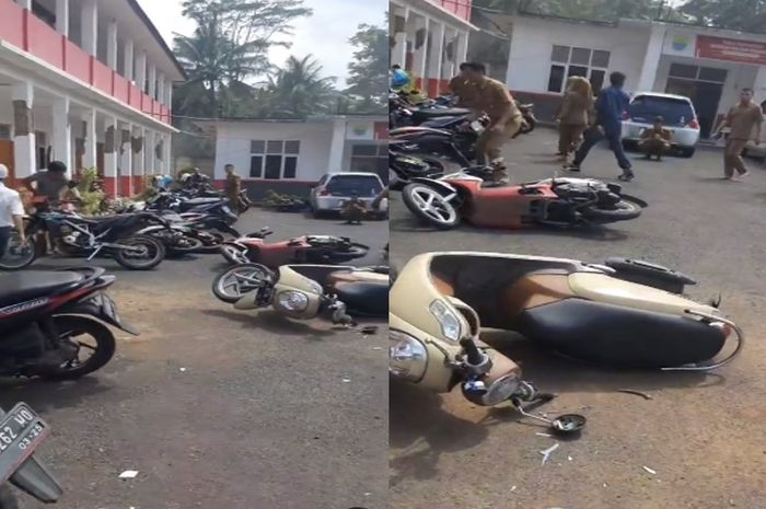 MOTOR Plus-Online.com - Sebuah video memperlihatkan detik-detik belasan motor ambruk lantaran guncangan gempa yang terjadi di Cianjur.