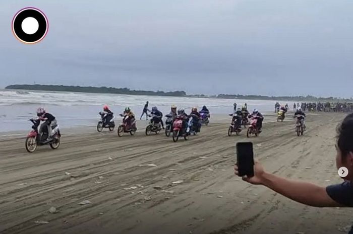 MOTOR Plus-online.com - Aksi balap motor di pinggir pantai Ujunggenteng, Sukabumi tersapu ombak, banyak pembalap yang berjatuhan.