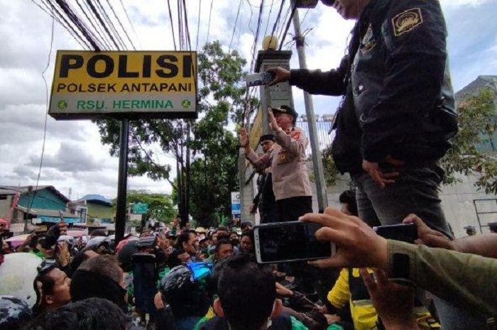 Setelah menyerang markas ojek pangkalan Pasir Impun, para driver ojol ini langsung mendatangi Mapolsek Antapani.