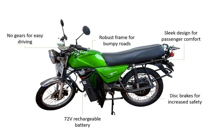 Biasanya motor listrik itu digunakan oleh boda bodas, yaitu ojek yang populer di sebagian besar Afrika.