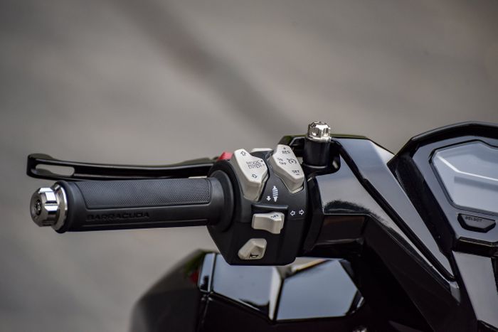 Panel saklar unik ini pun membawa kesan moge di area setang, ditambah terdapat pula lampu LED untuk menyinari tombol-tombol tersebut.