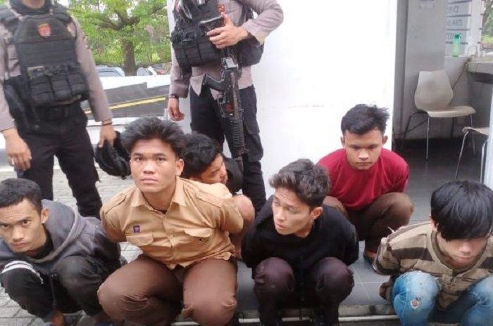 Nampak anggota geng motor yang ditangkap merupakan pelajar yang masih mengenakan seragam sekolah.