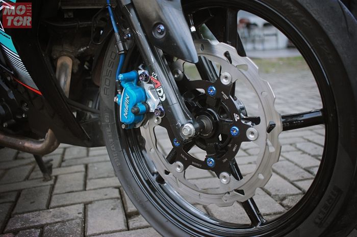 Cakram depan diganti RCB floating 298 mm, dengan kaliper Nissin Samurai 2 piston.