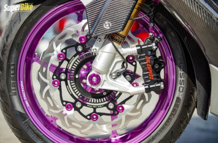 Di bagian depan, terpasang piringan bergelombang Kaui dan dipadukan kaliper dari Galespeed.