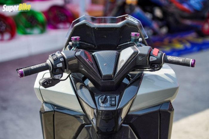 Pada bagian dek dan juga sekitar setang motor matic 350 cc ini juga terpasang motif karbon.