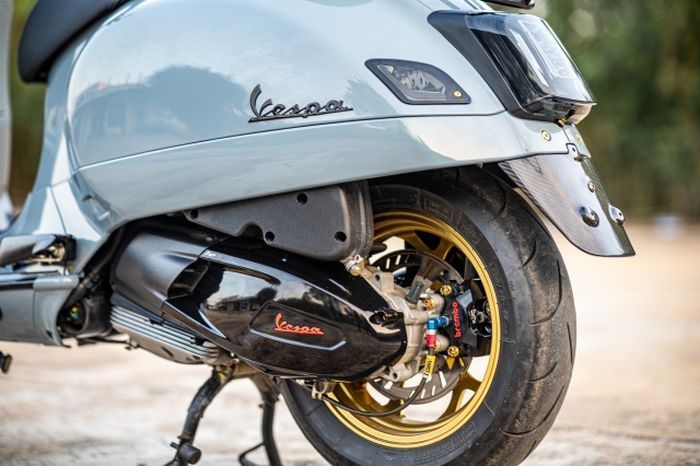 Turun ke kaki-kaki, Vespa GTS 300 ini menggunakan pelek CNC Maru's Factory W252 warna emas.