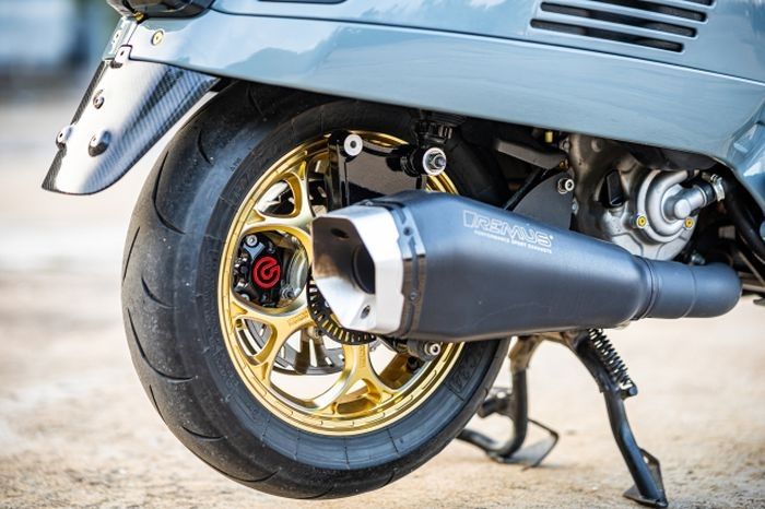 Lanjut sektor mesin, terpasang muffler knalpot Remus yang bikin suara Vespa GTS 300 makin sangar.