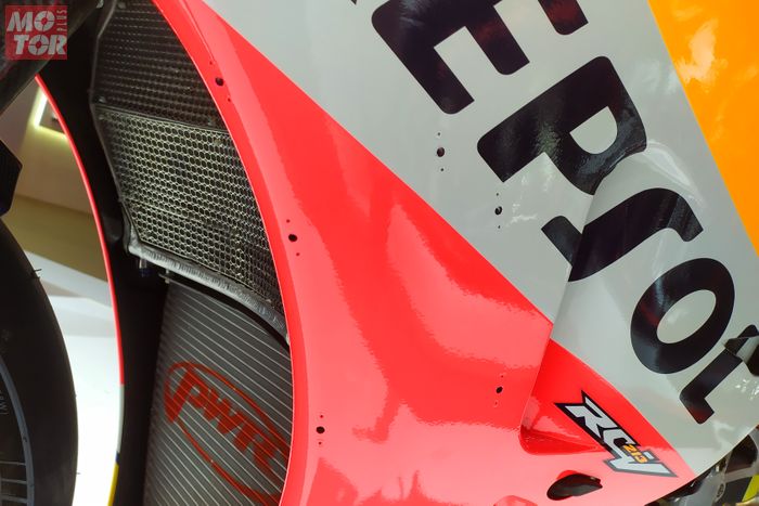 Ada lubang-lubang di bodi Honda RC213V tersebut dan ternyata lubang ini yang membuktikan kalau ini adalah motor asli yang digunakan untuk balapan.