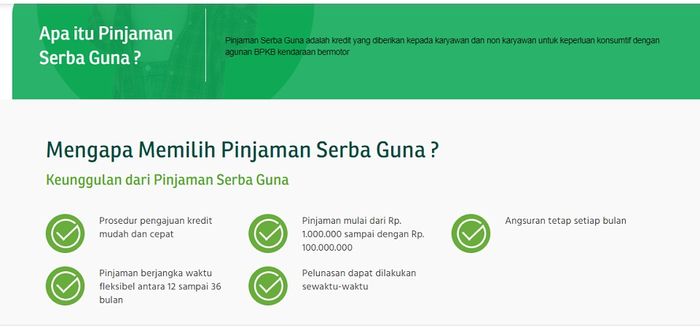 Pinjaman Serba Guna adalah kredit yang diberikan kepada karyawan dan non karyawan untuk keperluan konsumtif dengan agunan BPKB kendaraan bermotor.