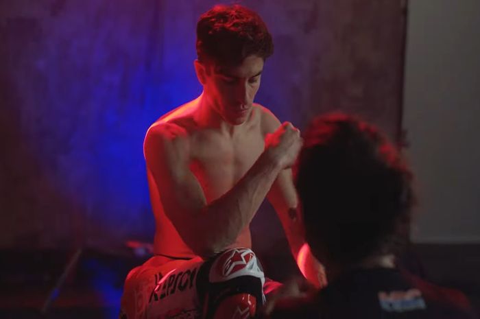 Pada adegan tersebut, Marc Marquez tampak sengaja memperlihatkan bekas lukanya di bagian lengan kanan atas.