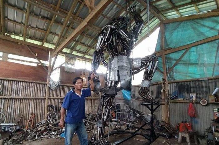 Ia membangun sebuah patung Hanoman setinggi 3 meter dengan menyusun ratusan knalpot brong bekas ini.
