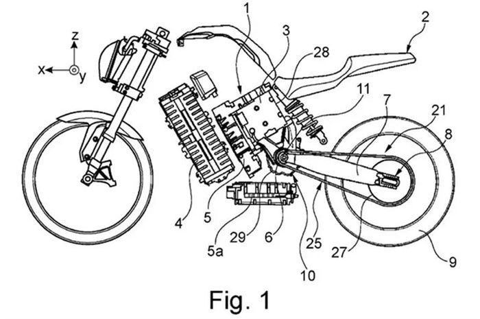 Yang menarik, dari gambar paten tersebut tampak desain motor listrik ini mengusung gaya naked bike.