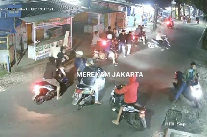 Bahkan gerombolan yang biasa disebut gengster atau geng motor ini sempat berhenti dan terlihat menyerang ke arah yang tidak terekam kamera CCTV.