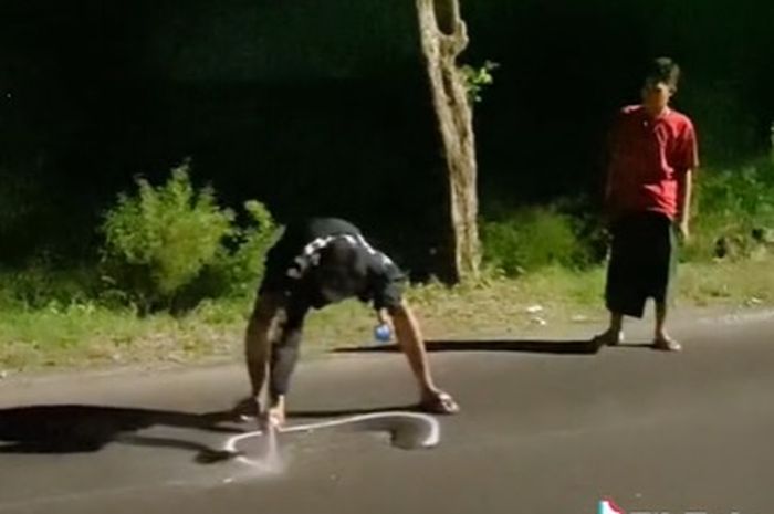 Mereka beramai-ramai memberi tanda jalan berlubang menggunakan cat semprot berwarna putih.