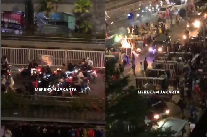 Geng motor terus menembakkan petasan dari atas flyover Senen.