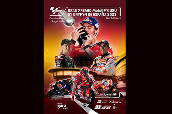 Poster resmi MotoGP Spanyol 2023 versi sirkuit penyelenggarakan menampilkan 3 foto pembalap MotoGP musim ini.