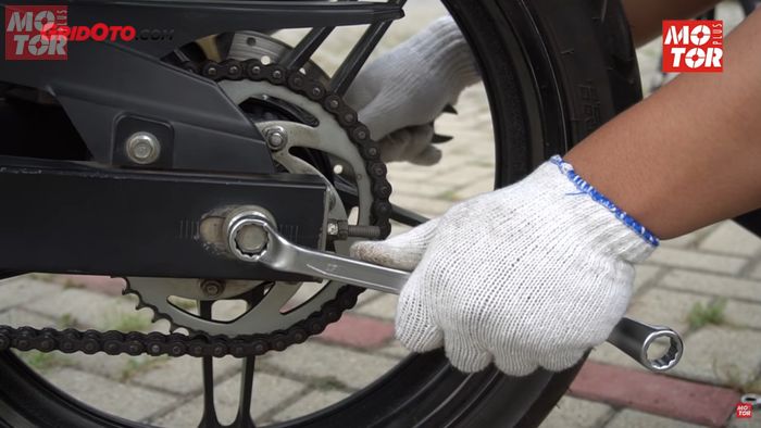 Lalu pakai kunci 12 untuk memutar baut ketegangan rantai, jangan lupa cek dulu kondisi rantai terlalu kencang atau kendur dan sesuaikan sesuai anjuran pabrikan.