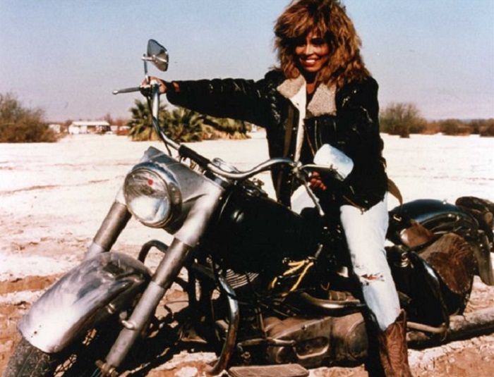 Selain itu, Tina Turner juga nampak menggunakan pakaian formal tengah berpose di sebuah Harley-Davidson.