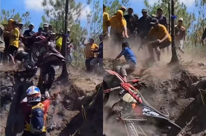 Ketika pengemudi motor trail ingin menaklukan jalur yang menanjak, tiba-tiba ia kehilangan kendali.