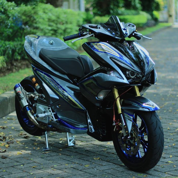 MOTOR Plus-online.com - Aura sporty keluar abis dari modifikasi motor Yamaha Aerox ini, bodi penuh dengan air brush kaki-kaki disupport komponen mewah.
