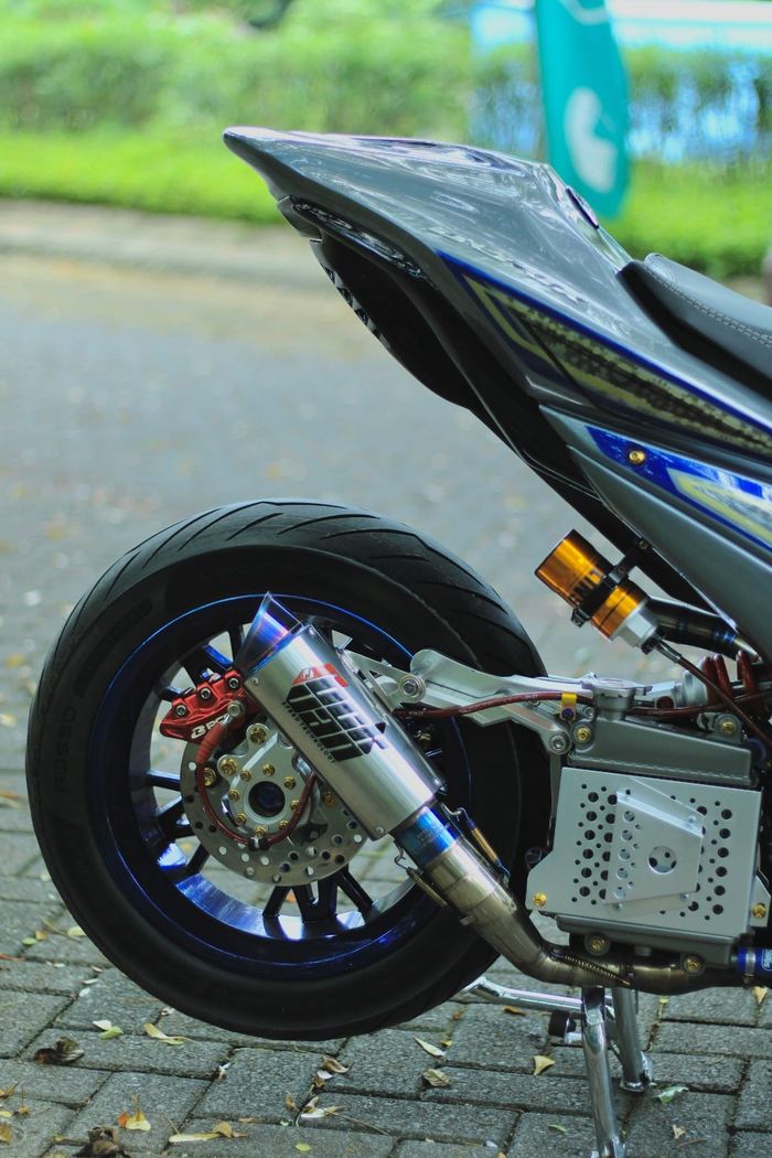 "Kaki-kaki belakangnya full custom. Mulai dari monoshok, swing arm, sampai peleknya custom tapak lebar yang saya baru ban Pirelli Diablo Rosso," tambahnya.