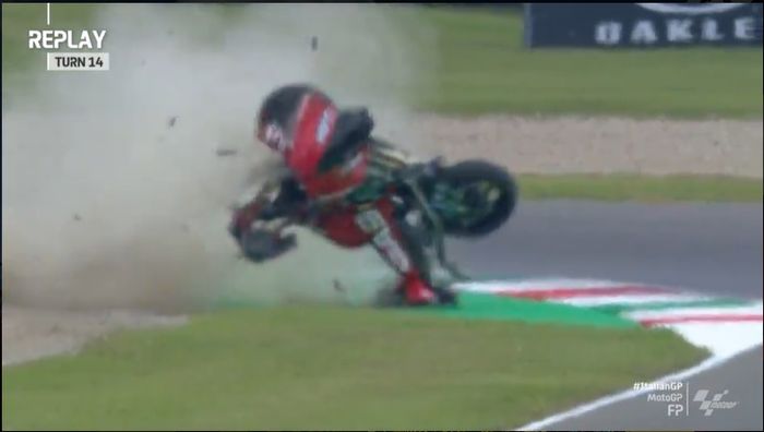 Ia kehilangan daya cengkeram ban depan, motornya terpelanting dalam kecepatan tinggi dan bodinya langsung hancur.