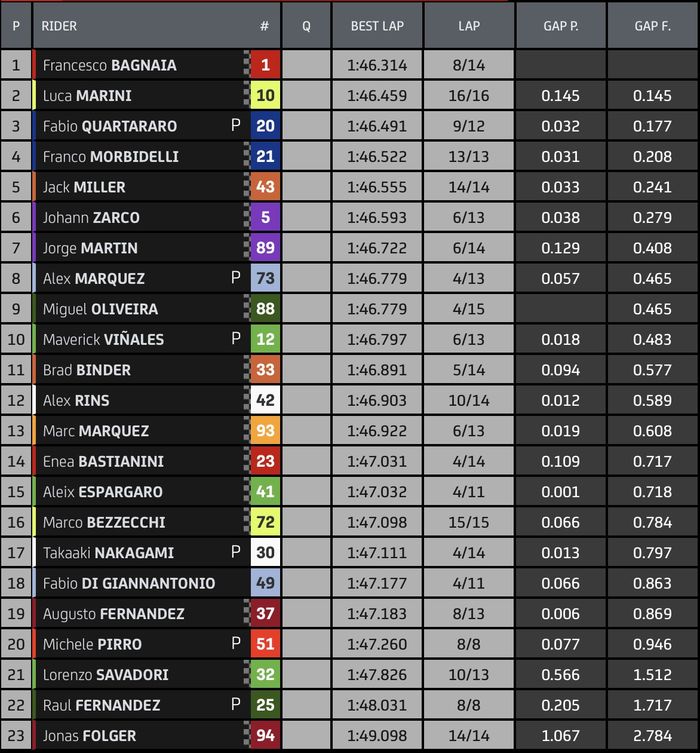 Catatan waktu Francesco Bagnaia makin tajam menjadi 1;46,314 dan ia amankan peringkat pertama.